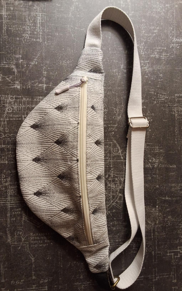 Redécouvrez l'accessoire incontournable de la saison avec cette banane artisanale, alliant praticité et sophistication. Confectionnée avec soin dans mon atelier, elle se distingue par son tissu extérieur en Jacquard brillant aux motifs géométriques argentés (style Art Déco/Éventail), qui apporte une touche de lumière immédiate à n'importe quelle tenue, du jean décontracté à la robe de soirée.