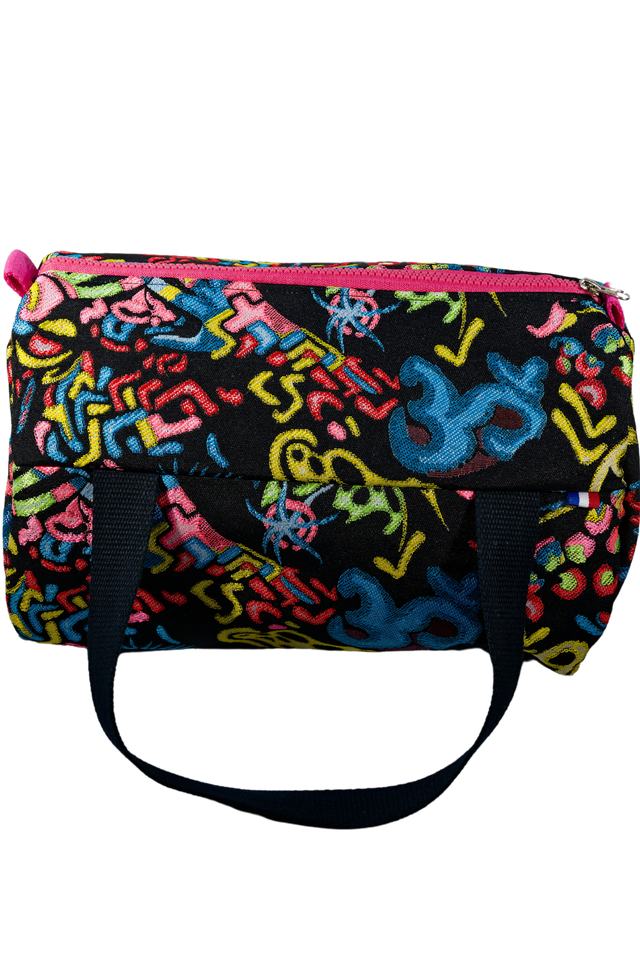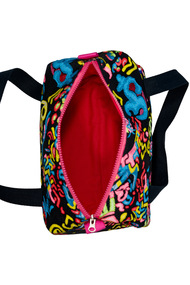 Son motif brodé multicolore sur fond noir apporte une touche résolument audacieuse, tandis que la fermeture éclair rose ajoute un détail féminin et pratique. Les poignées en sangle assurent un port confortable à la main ou sur l’épaule. L’intérieur, entièrement doublé, protège efficacement vos affaires et facilite l’organisation.