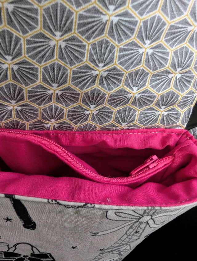 La surprise colorée : Sous le rabat doublé d'un motif géométrique gris et jaune, découvrez un intérieur rose fuchsia vibrant qui apporte une touche de modernité et de joie immédiate !